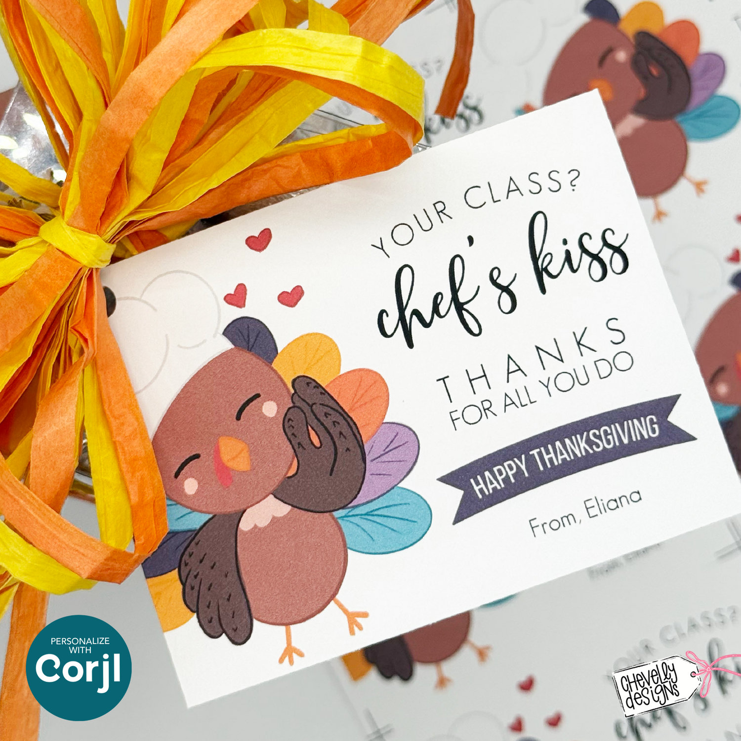 Editable Thanksgiving Turkey Gift Tag: “Your Class? Chef’s Kiss” Teacher Appreciation Printable (HT103a)