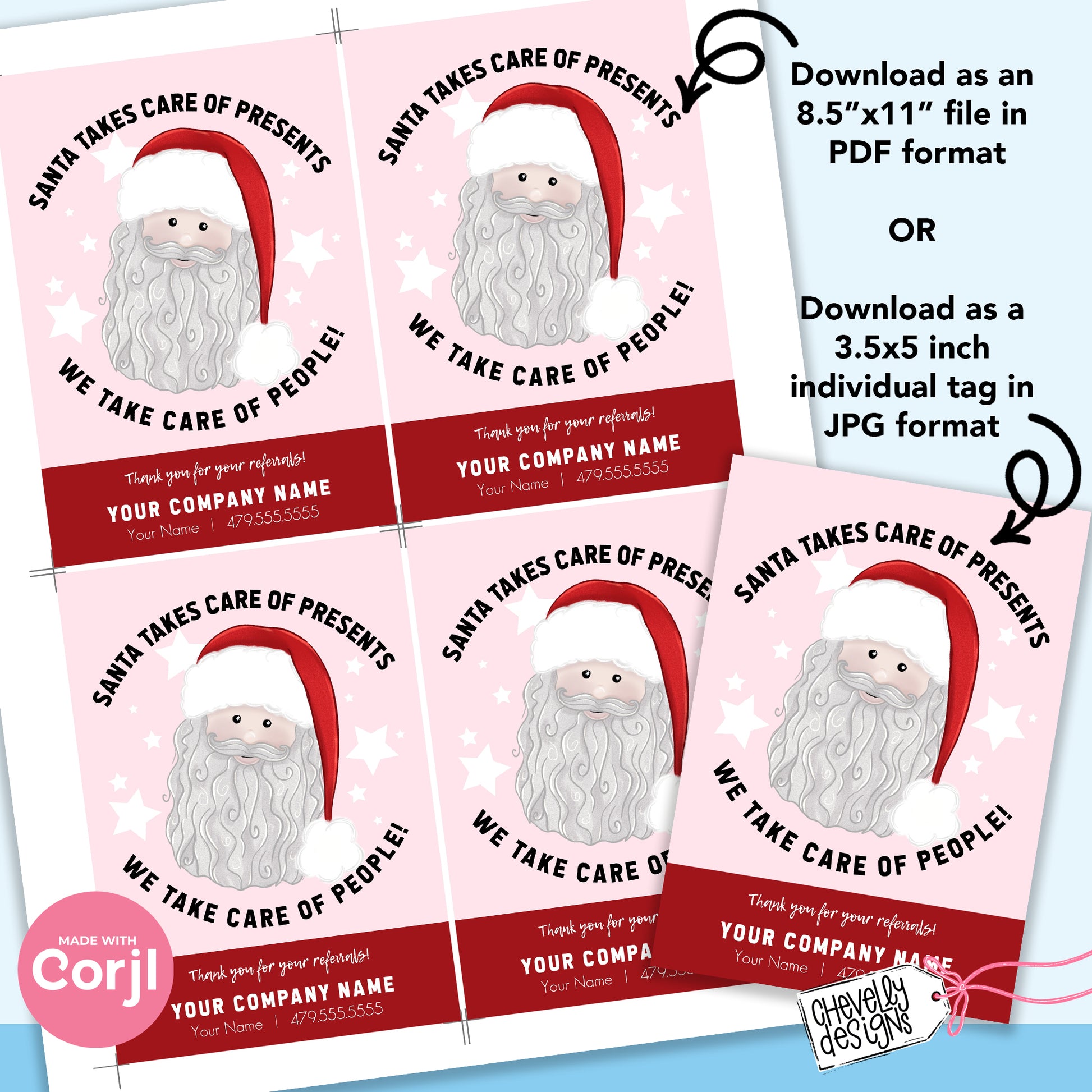 EDITABLE Christmas Referral Gift Tags - Santa Takes Care of Presents, We Take Care of People - Printable, Digital Download