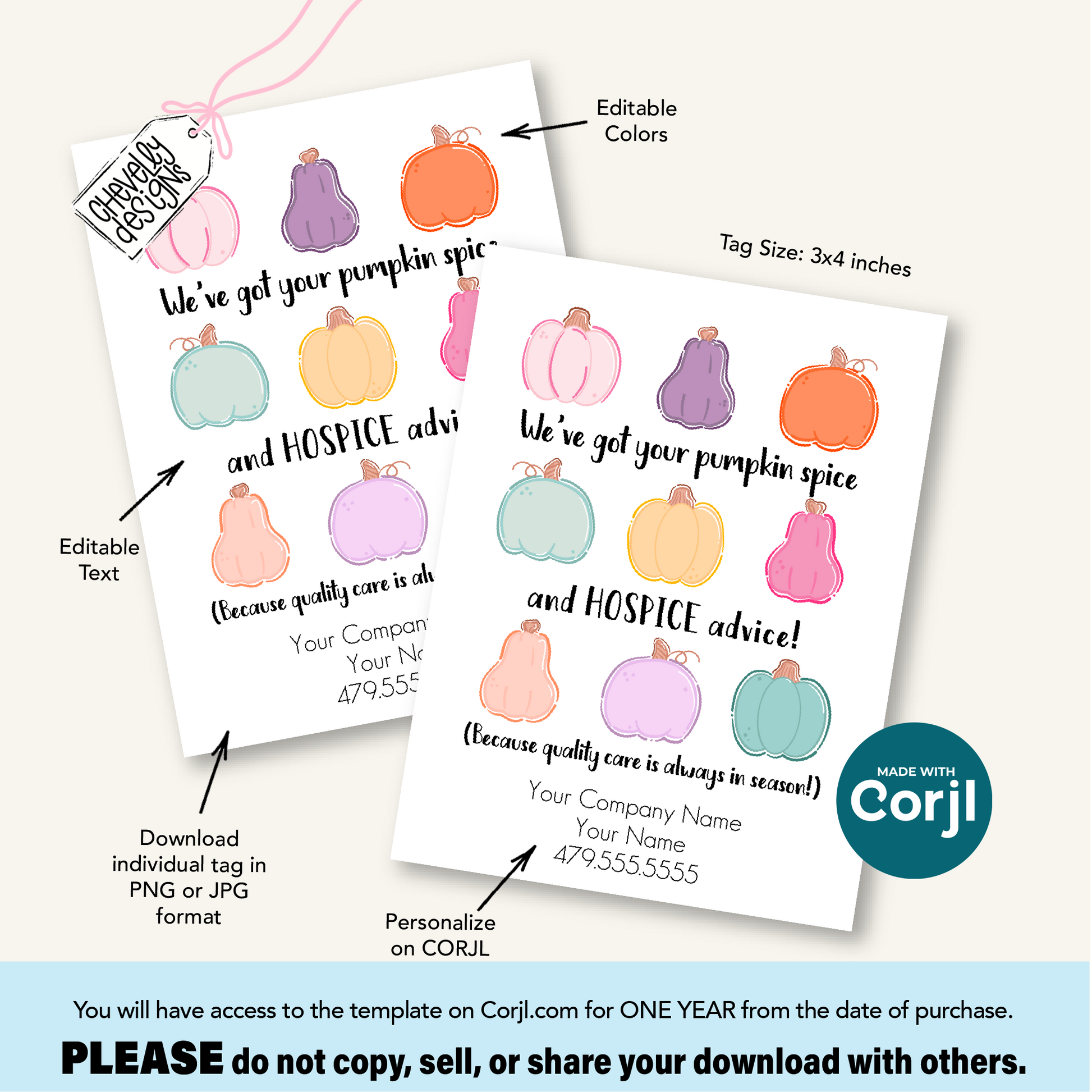 Editable Fall Referral Gift Tag | Pumpkin Spice & Hospice Advice | Printable Marketing Labels - Digital File