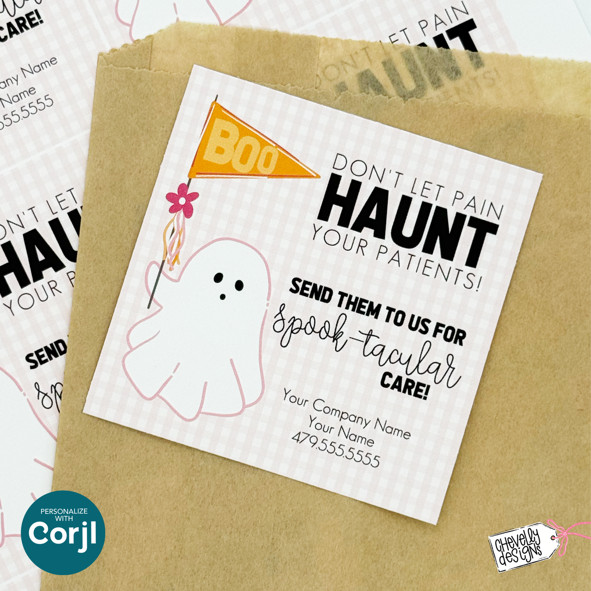 This printable referral marketing gift tag features an adorable hand-drawn ghost holding a pennant banner that says “BOO,” paired with the phrase: “Don’t let pain haunt your patients! Send them to us for spooktacular care.”
