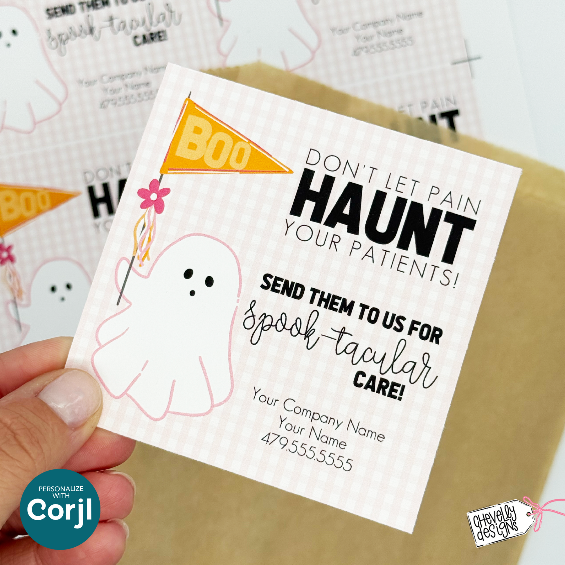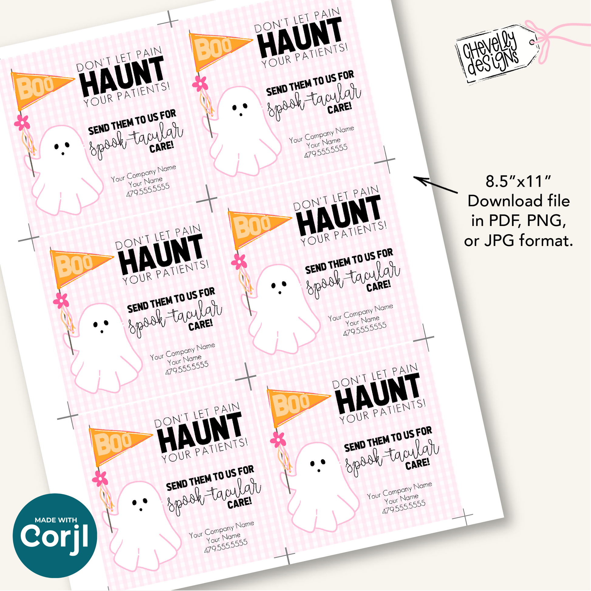 Perfect for pairing with festive treats, candy bags, or small gifts, this Halloween referral tag is a creative way to keep your home health, hospice, or therapy business top of mind. With editable text in Corjl, you can easily customize the wording, colors, and your company name and contact information.