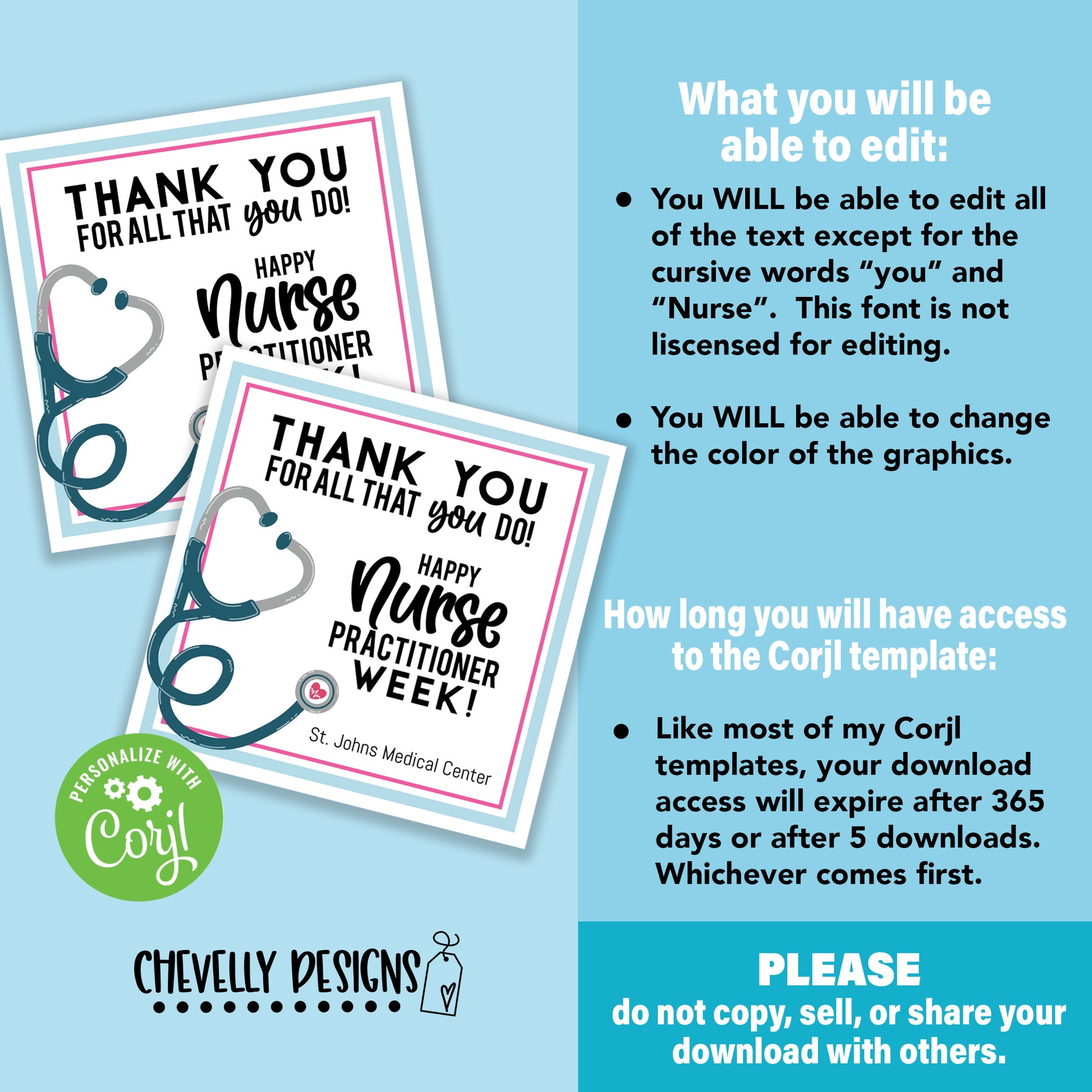 -You WILL be able to edit all of the text except for the cursive words “you” and “Nurse”. (This font is not licensed for editing.)