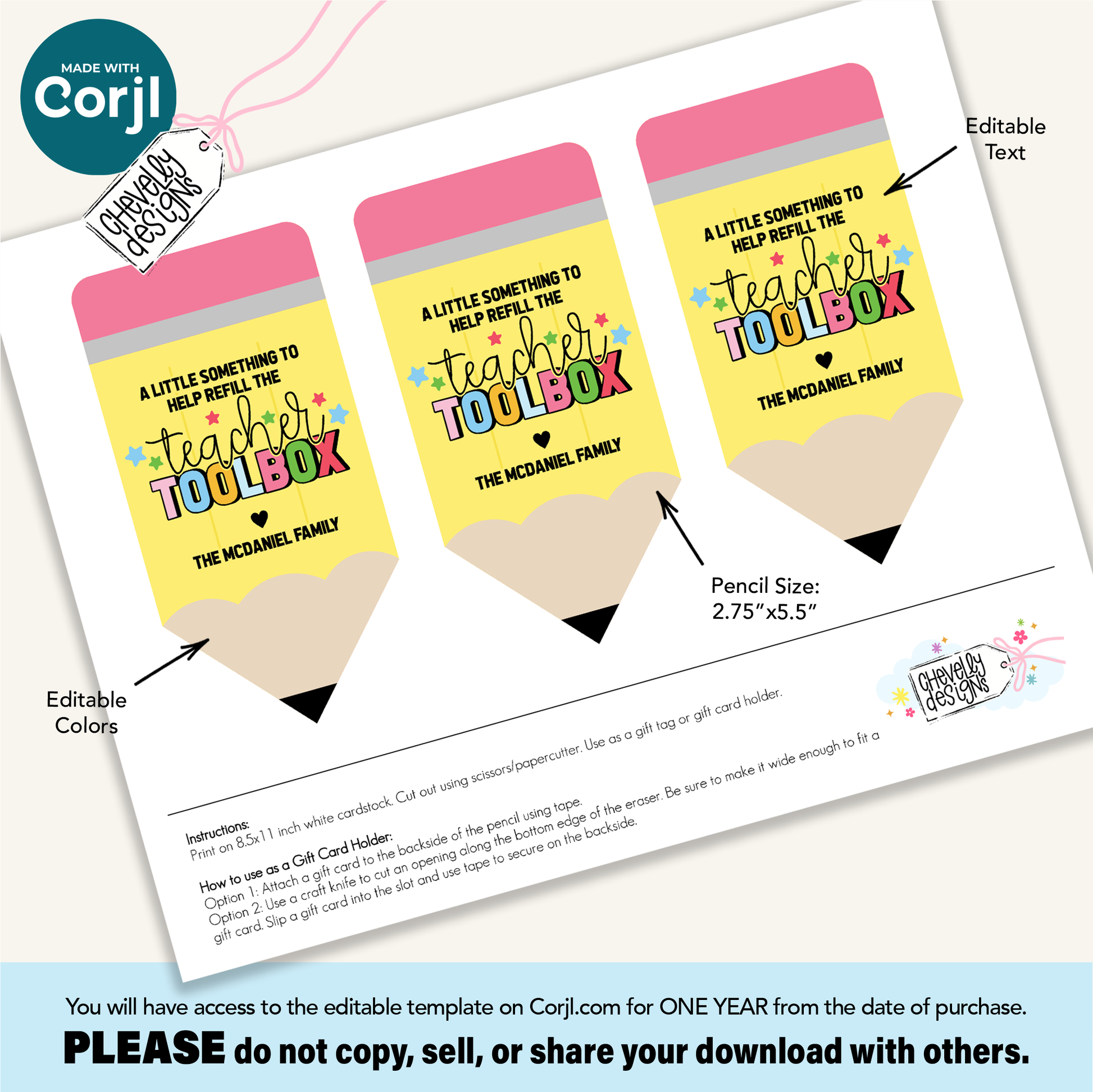 Make teacher gifting easy and thoughtful with this Editable Pencil Gift Card Holder! Perfect for back-to-school season or teacher appreciation, this printable design is shaped like a classic pencil and includes space to hold a gift card...ideal for helping teachers stock up on their own classroom supplies.