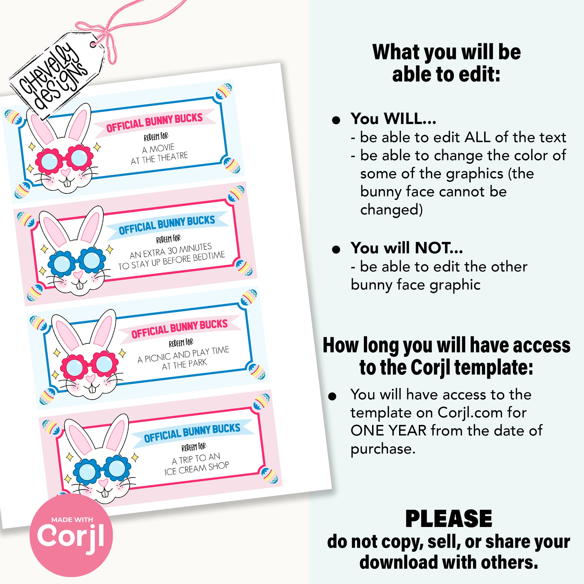 EDITABLE - Printable Bunny Bucks, Easter Basket Egg Filler, Fun Easter Coupons for Kids & Teens - Digital File
