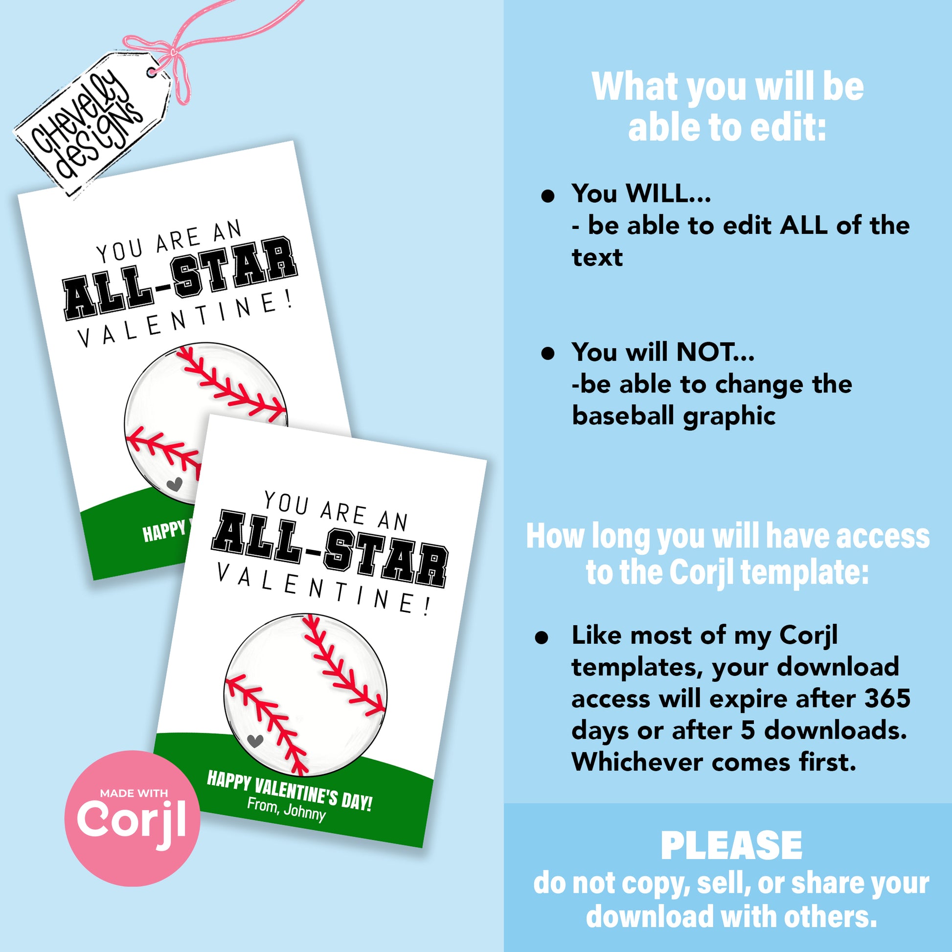 EDITABLE - You are an All Star Valentine - Baseball, Sports, Student Class Party Cards - Printable Digital File