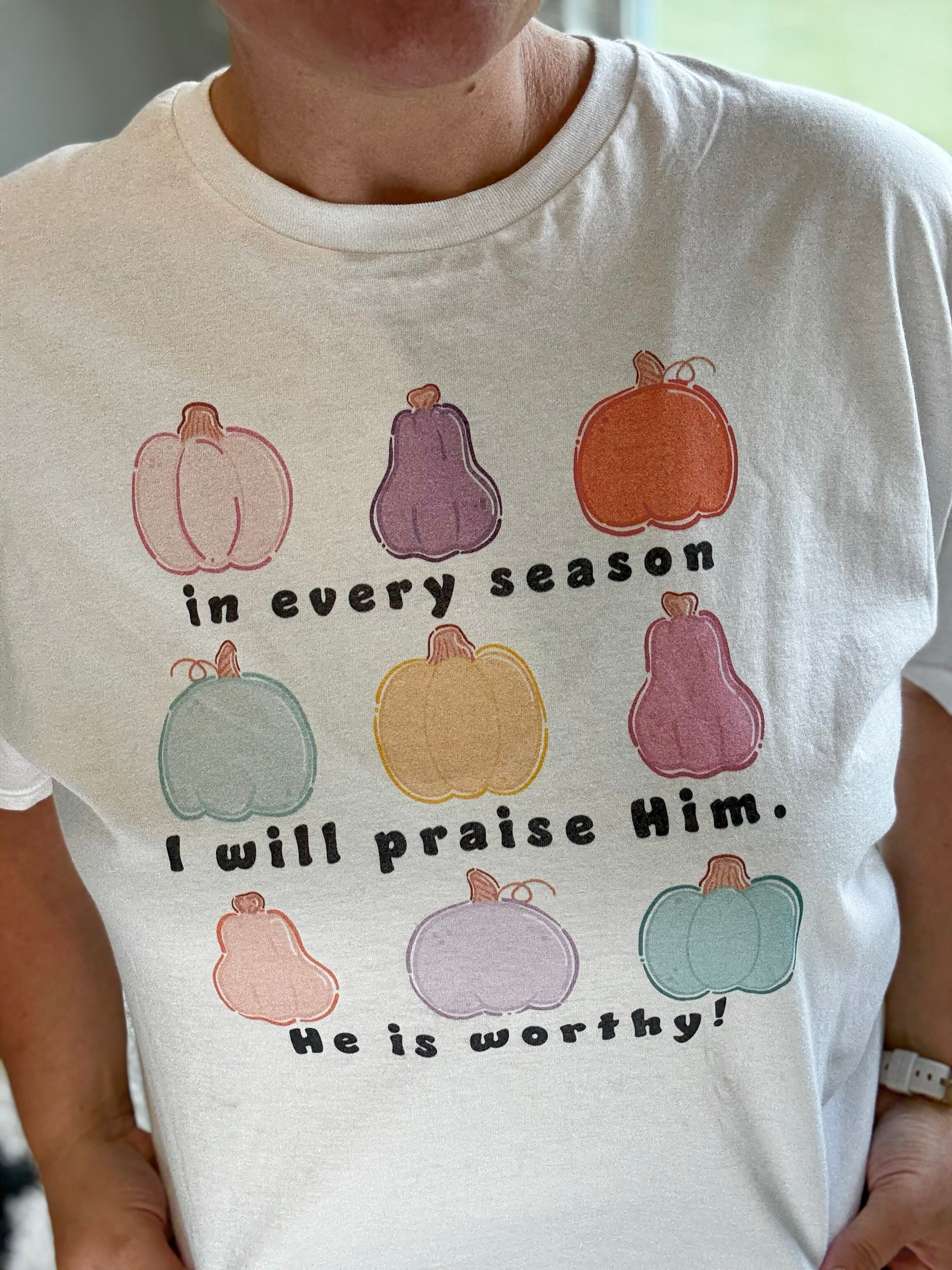 In Every Season I Will Praise Him | Fall & Halloween Graphic Tee | Christian Pumpkin Shirt | Faith-Based Autumn Apparel